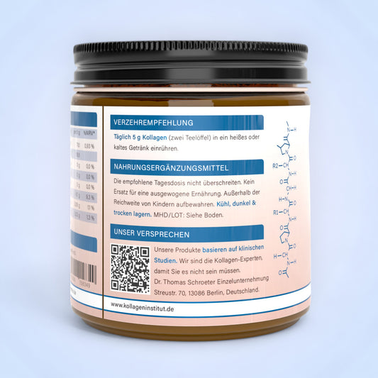 Unser Marine Kollagen ist von kompromissloser Produktqualität und wird ausschließlich in Deutschland hergestellt und im Labor auf seine Reinheit getestet. Wir verzichten bewusst auf Zusatz-, Konservierungs-, Farb- und Süßstoffe sowie künstliche Aromen.