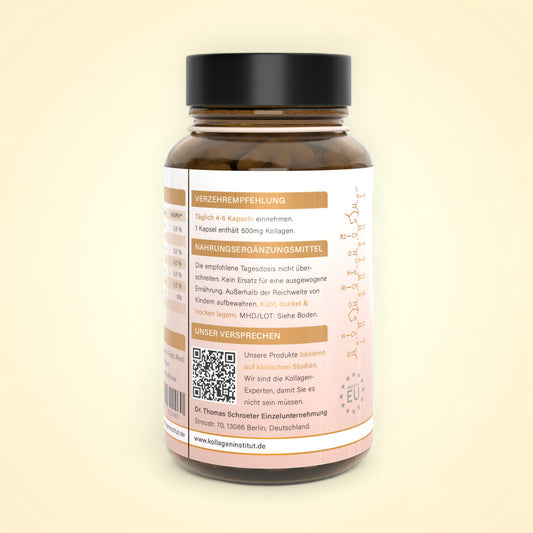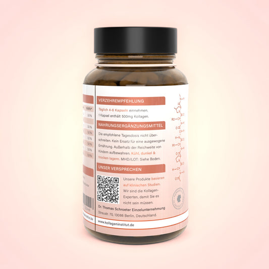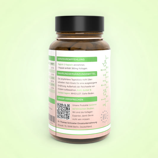 Our collagen capsules are typically dosed in such a way that the body is supplied with approx. 2-3 grams of collagen per day. This corresponds to 4-6 collagen capsules per day.