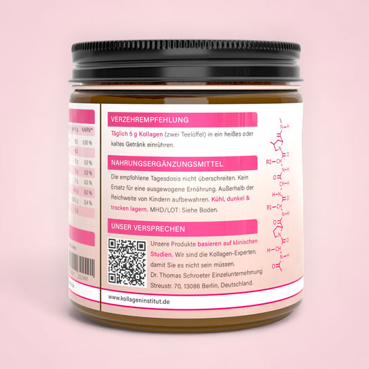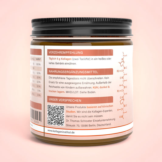 Our collagen powder is fine, pure and perfectly soluble. This dosage is considered ideal as it is both scientifically effective and practical. Most scientific studies recommend 2.5 to 5 grams of collagen per day. Too low a dosage is not sufficient to stimulate the body's own collagen metabolism. Too high a dosage of 20 grams, for example, is difficult to integrate into everyday life and not very practical. Please always follow our dosage instructions on the back of our products!